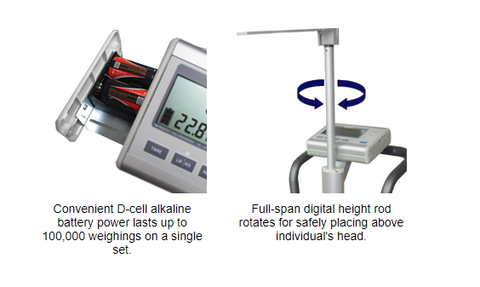 The WH-1070 Tilt & Roll digital scale with an integrated height rod quickly determines weight, height, and BMI. The height rod headpiece rotates 360° so the headpiece can be positioned away from the person’s face when being unfolded and then raised above the person’s head. The WH-1070 is truly a versatile scale that has the security of a handrail and wheels for tilt & roll capability.