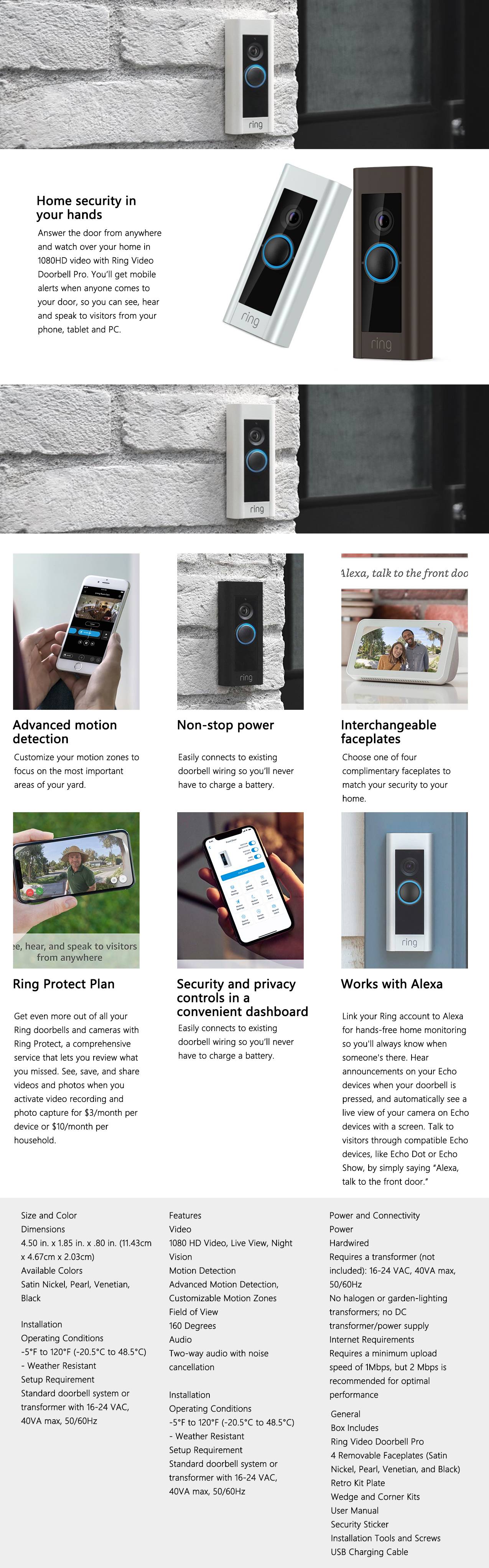Brand Ring Model Video Doorbell Pro Type Smart Doorbell Compatibility Amazon Alexa Compatibility Yes Specification Specifications Volts: 16-24 VAC, 40VA max, 50/60Hz