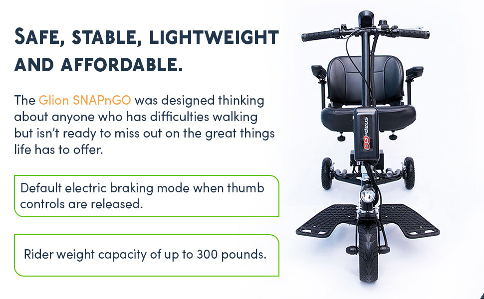 Important Note: Riders should be able to stand and walk independently and have good vision, strength, coordination and balance to safely operate the Glion SNAPnGO. They must be able to mount or dismount the SNAPnGO scooter without help, or risk of falling. The Glion SNAPnGO is not intended for medical purposes to provide mobility to someone restricted to a sitting position. It is not a medical device nor a wheelchair.Product Video