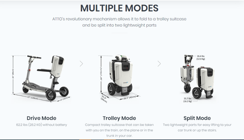 The ATTO Folding Scooter is the most innovative folding scooter on the market. This robust full-size mobility scooter quickly folds into a trolley suitcase that can be taken with you on the train, on the plane or in the trunk in your car. The ATTO folds and unfolds in less than 12 seconds! Traveling with the ATTO is a breeze, and it's FAA approved for safe airline travel.