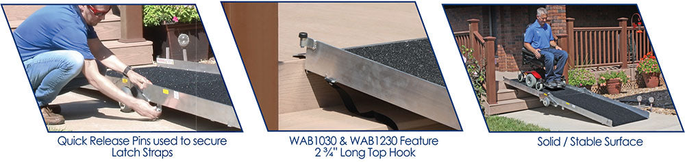 The unique design of the PVI Wheel-A-Bout wheelchair ramp makes setup and handling a breeze. Integrated wheels allow you to simply roll the ramp out to the required location, while the closure strap locks keep the panels together until you are ready to unfold the ramp. The high-traction, the full platform provides excellent stability for a wide range of wheelchairs and scooters with various wheel configurations. When not in use, the ramp can be folded up and conveniently stored upright and out of the way.